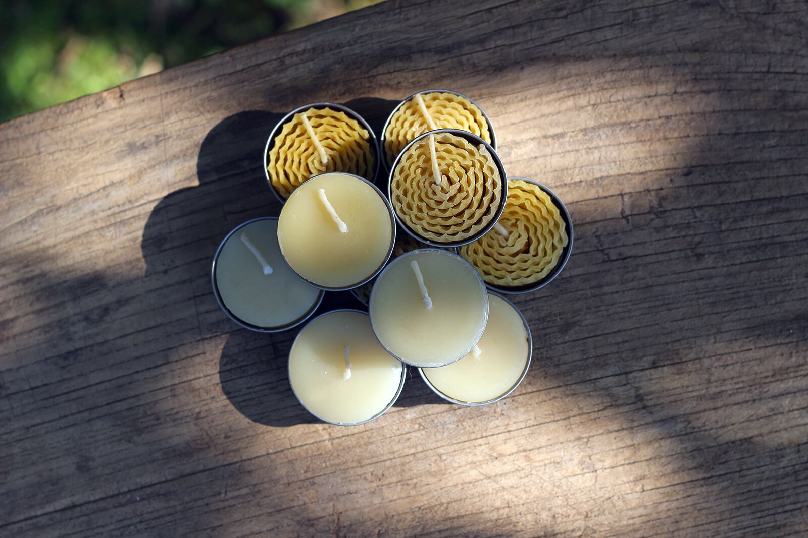 燃焼時間の短いハニカムティーライトと長く楽しむことが出来る蜜蝋ティーライトをセットに致しました。